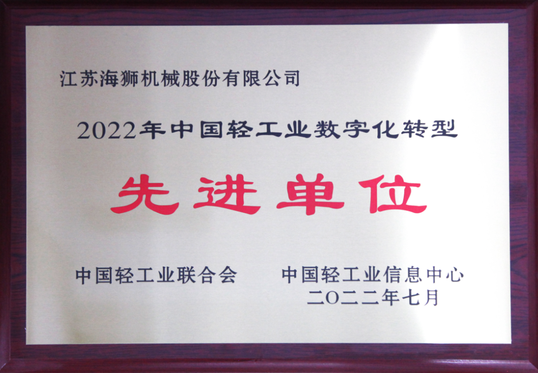 會上,江蘇海獅機械股份有限公司榮獲“2022年中國輕工業(yè)數(shù)字化轉型先進單位”表彰。江蘇海獅機械陳宏董事長榮獲"2022年中國輕工業(yè)數(shù)字化轉型領軍人物?!?/p>